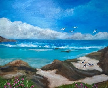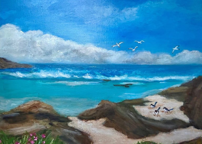 Growing up in Milan and living in NSW for over 20 years means my subjects are a blend of Italian memories and Aussie amazing nature. Most of my work is inspired by the Australian coast, native birds and flowers, open skies, and gentle human presence. I’m drawn to long horizons, beaches, soft light and the feeling of space — the kind of places where your shoulders drop and your breath deepens.
